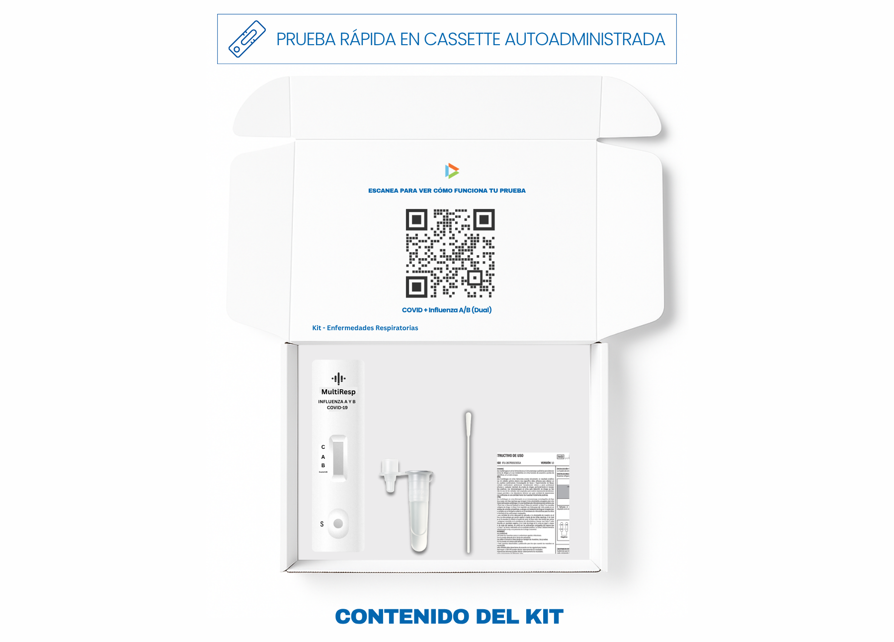 El panel de detección inmunoenzimática (prueba rápida), está diseñada para la detección de antígeno para proteína de SARS-CoV-2, antígenos de núcleo proteínas de la Influenza A+B, en muestras de exudado faríngeo, aspirado e hisopado nasal.