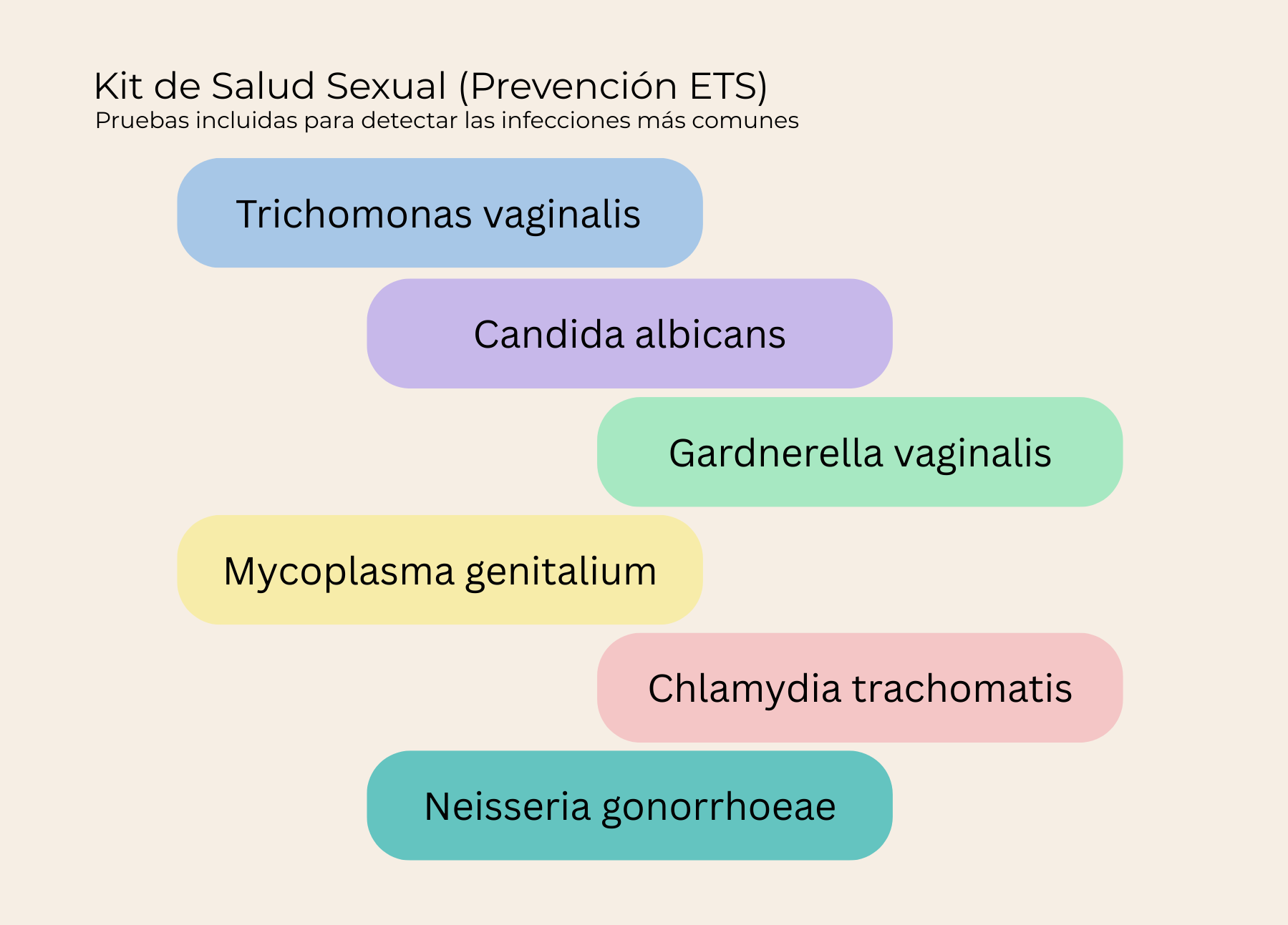 TRICHOMONAS VAGINALIS, CANDIDA ALBICANS, GARDNERELLA VAGINALIS, MYCOPLASMA GENITALIUM, CHLAMYDIA TRACHOMATIS y NEISSERIA GONORRHOEAE. Por favor revisa el detalle de tu prueba para obtener más información.